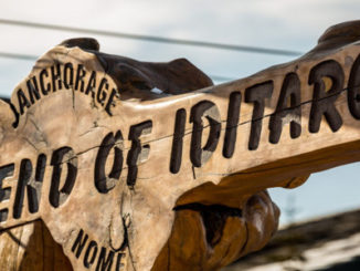 The Burled Arch awaits mushers in Nome. Days before the Iditarod Trail Sled Dog Race finished, on Sunday, March 12, a group of Chinese tourists arrived at Nome’s burled arch after mushing the trail